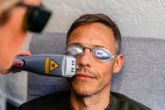 - Optikeren vår fører skånsomt IPL-instrumentet over hudområdet som skal behandles.